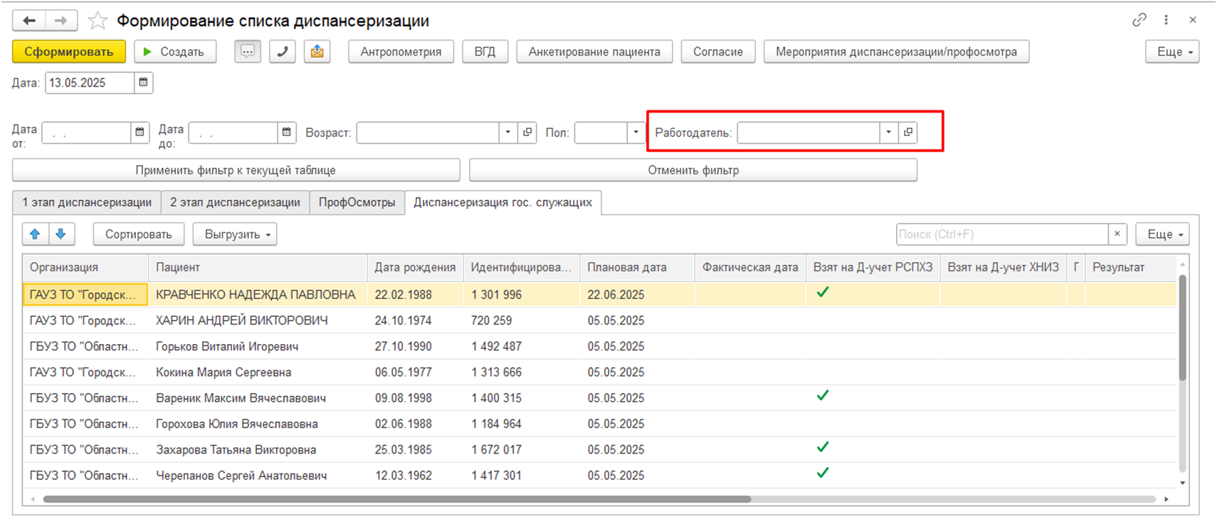 добавлен новый отбор по работодателю, данный отбор доступен при переходе на вкладку «Диспансеризация гос. служащих». При переходе на другие вкладки, отбор по работодателю не отображается (рис. №2).