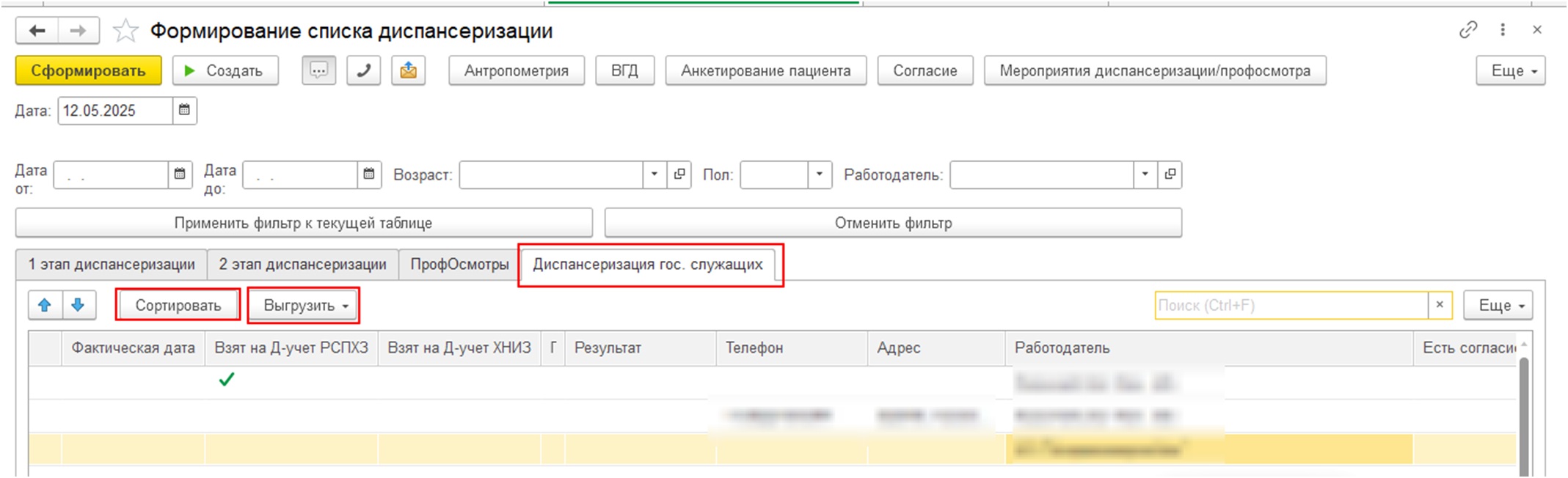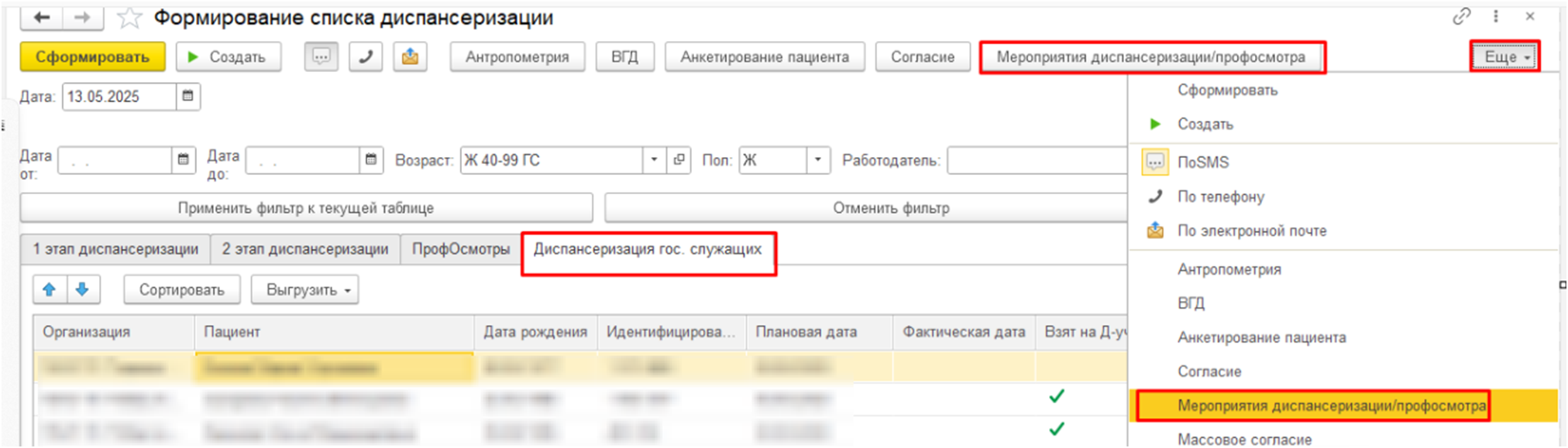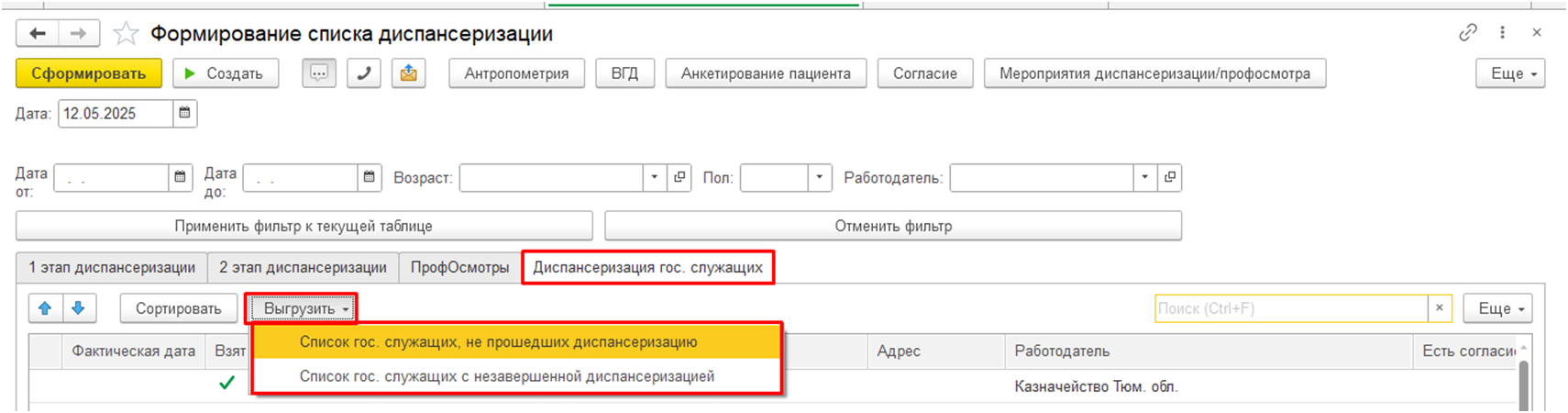 Рис. 3 Обработка «Формирование списка диспансеризации» - вкладка «Диспансеризация гос. служащих»