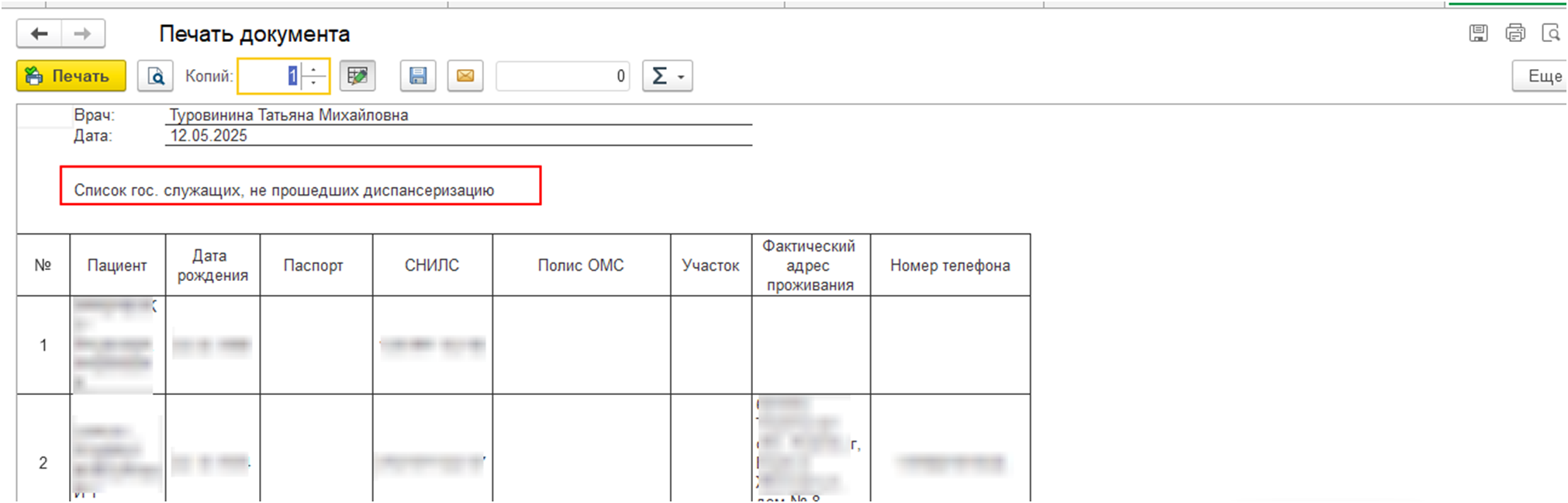 Рис. 5 Список гос. служащих, не прошедших диспансеризацию