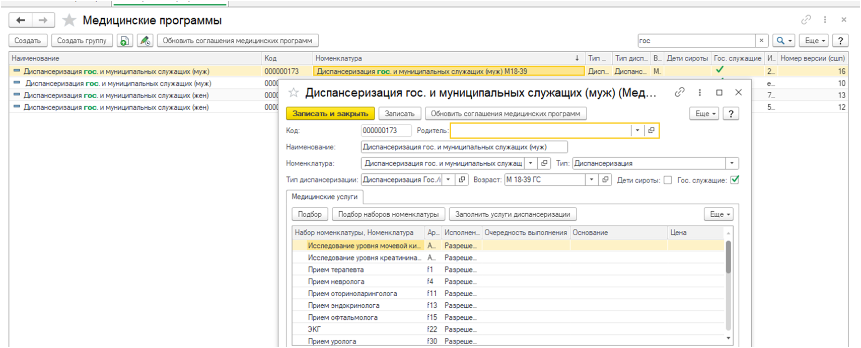 Рис. 7 Медицинская программа «Диспансеризация гос. и муниципальных служащих (муж) М18-39»