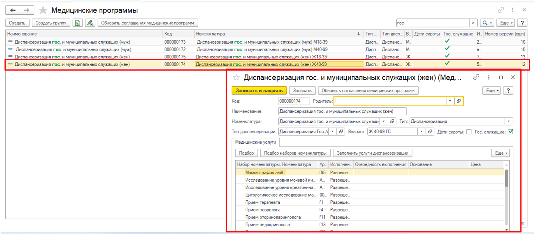 Рис. 8 Медицинская программа «Диспансеризация гос. и муниципальных служащих (муж) М40-99»