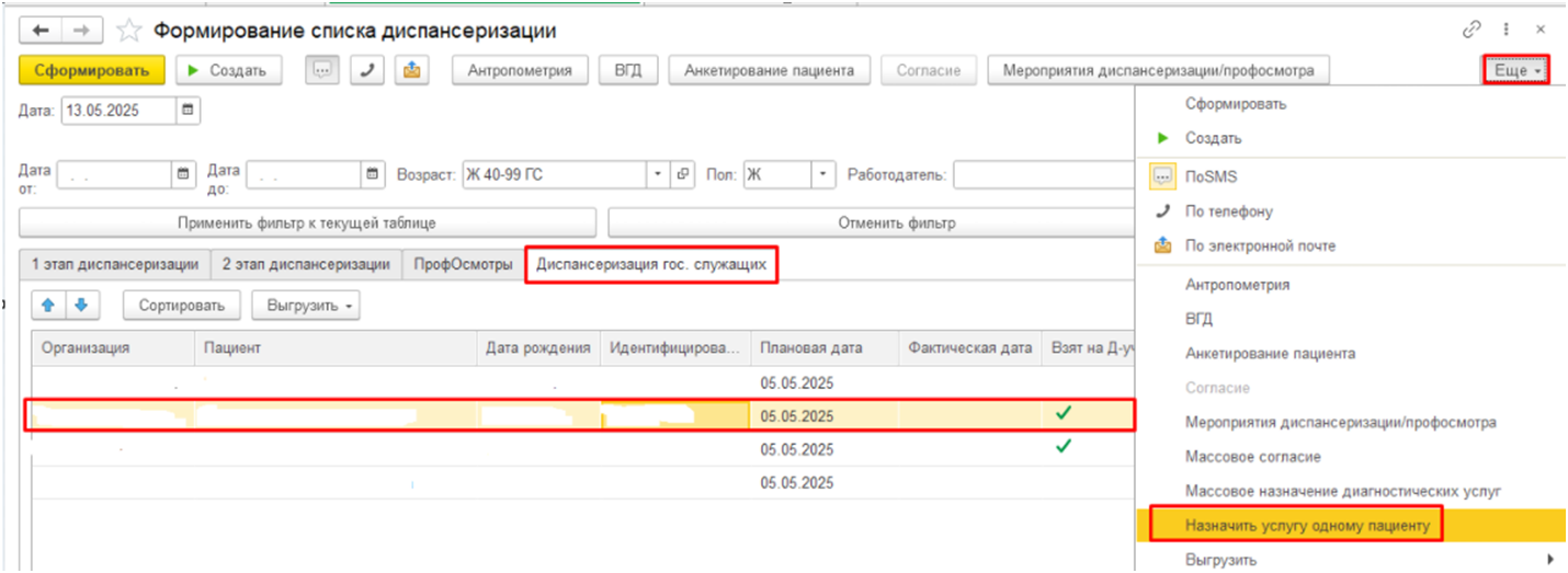 Назначение услуг осуществляется стандартным способом, ранее реализованным в обработке «Формирование списка диспансеризации», т.е. необходимо перейти на нужную вкладку, в данном случае это вкладка «диспансеризация гос. служащих», с помощью кнопки «Еще» раскрываем перечень функций, выбираем «Назначить услугу одному пациенту» (рис. №13).