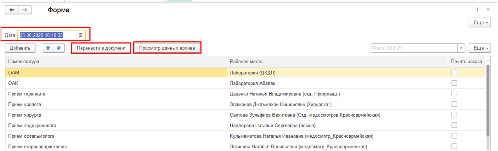 Таким образом, открывается форма, на которой отражены услуги согласно медицинской программе для гос./муниципальных служащих. На форме назначения услуг, при необходимости изменяем дату в поле «Дата», рабочее место - в столбце «Рабочее место», также можно добавить дополнительные услуги с помощью кнопки «Добавить». Для осуществления массового назначения услуг пациентам на форме необходимо нажать кнопку «Перенести в документ» (рис. №12).