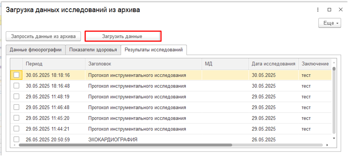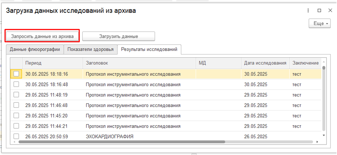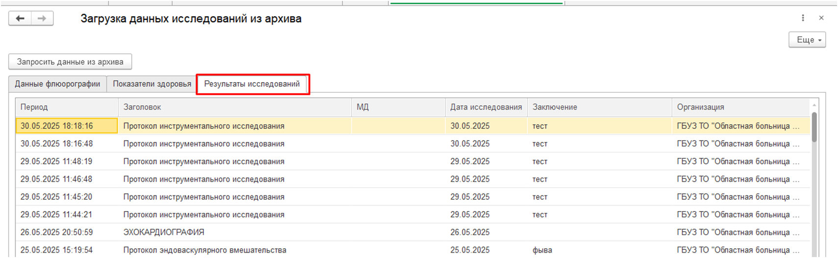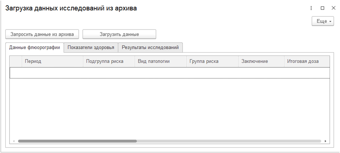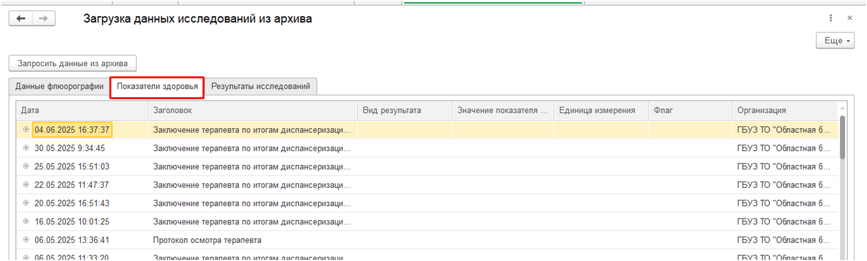 При нажатии на кнопку «Просмотр данных архива» открывается форма «Загрузка данных исследований из архива». На форме «Загрузка данных исследований из архива» запрос данных из из других МО осуществляется посредством кнопки «Запросить данные из архива», таким образом, имеющиеся у пациента подгружаются на три отдельные вкладки, в зависимости от типа данных: «Данные флюорографии», «Показатели здоровья», «Результаты исследований» (рис. №15, №16, №17, №18).