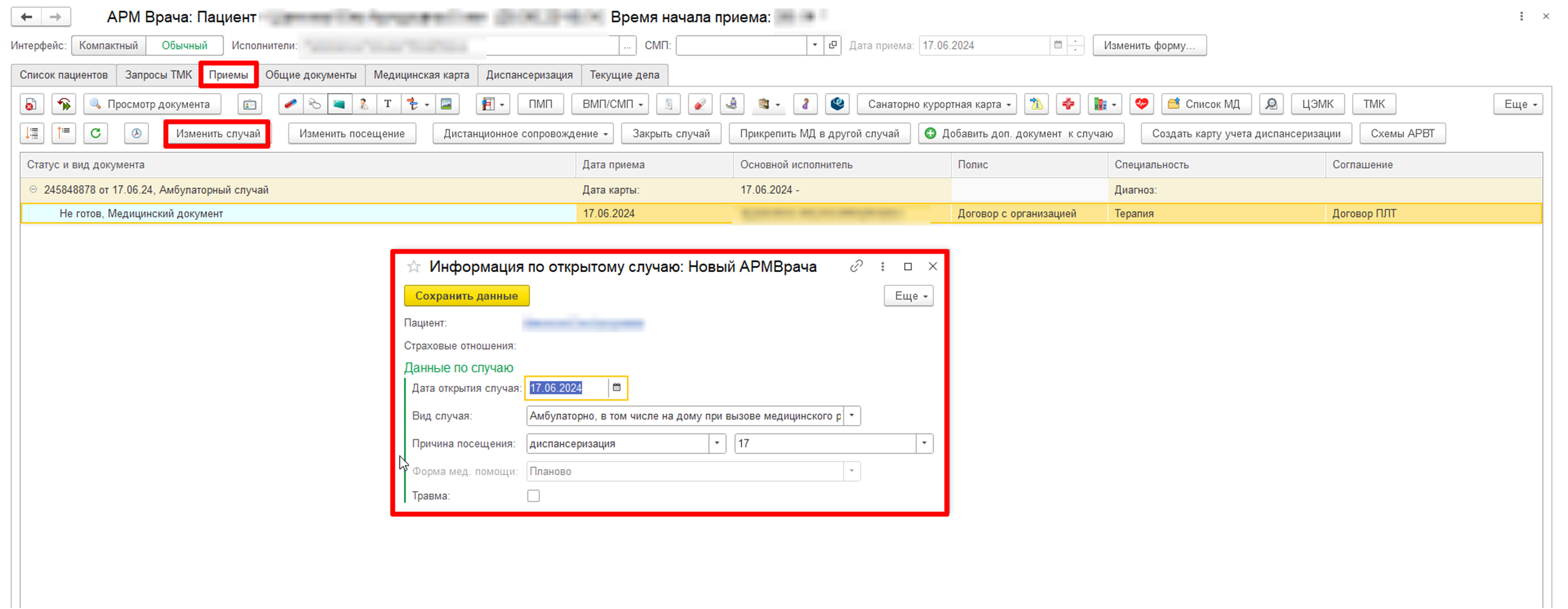 Таким образом, открывается форма АРМ врача – Список пациентов, переходим на вкладку «Приемы», на вкладке приемы стандартным способом оформляется прием пациенту, открывается случай и далее выбираем ШМД «Заключение терапевта по итогам диспансеризации/профосмотров» (рис. №4, рис. №5).