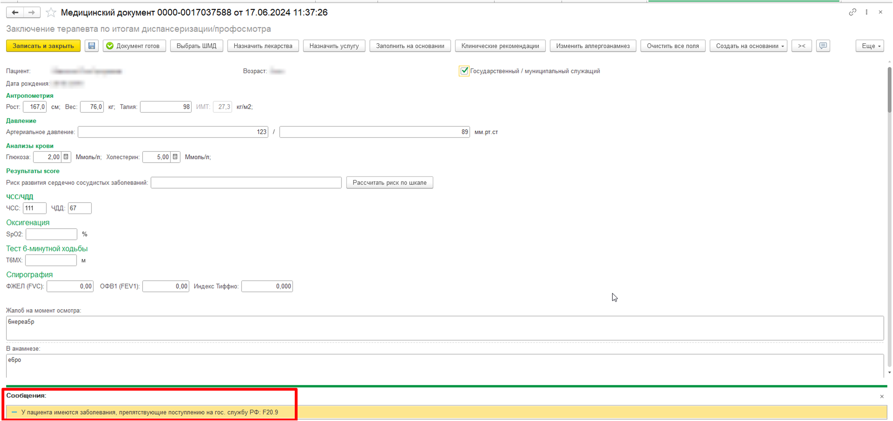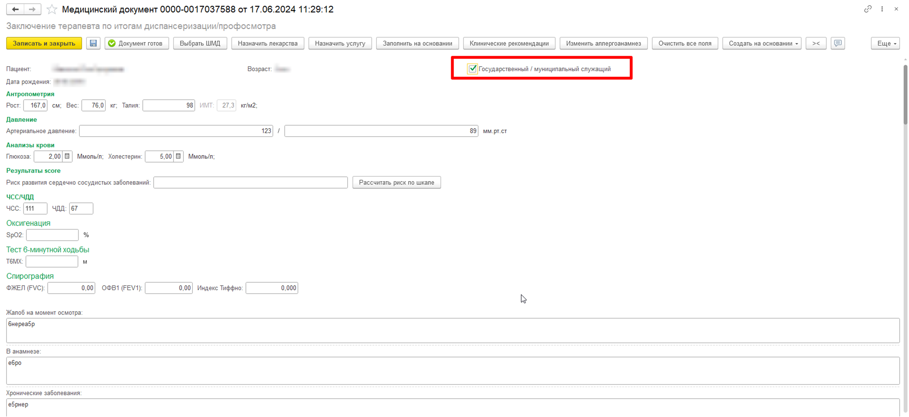 - При установлении галочки в чек-боксе «Государственный/муниципальный служащий» в «шапке» наименования появляется приписка о том, что это ШМД «Заключение терапевта по итогам диспансеризации/профосмотров Государственного/муниципального служащего» (рис. №9№27).
