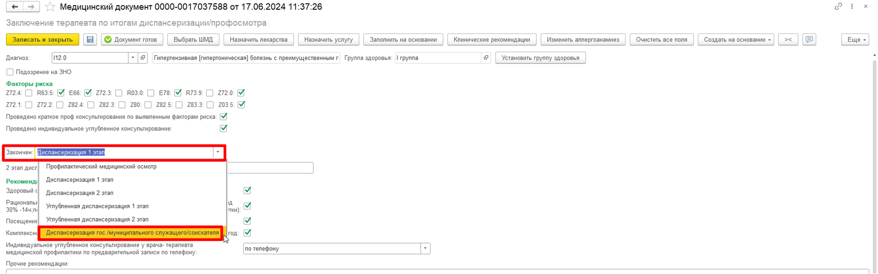 - В список к полю «Закончен» в ШМД добавлено новое значение - «Диспансеризация гос./муниципального служащего/соискателя» (рис. №8).