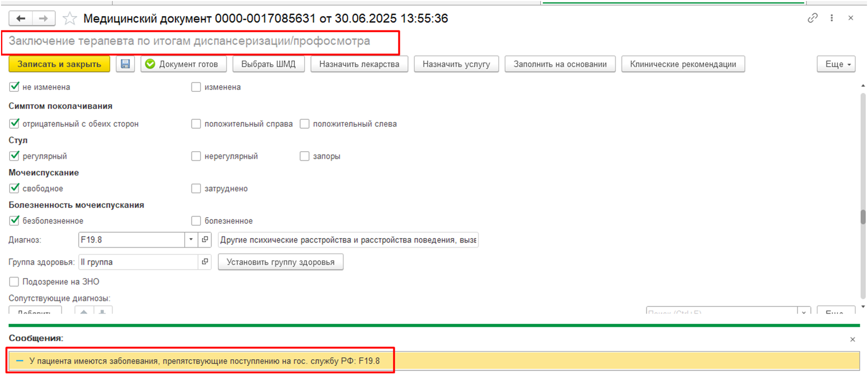 - Доработана проверка по пациенту на наличие диагнозов препятствующих гос. службе. Проверяются все диагнозы по пациенту (рис. №10).