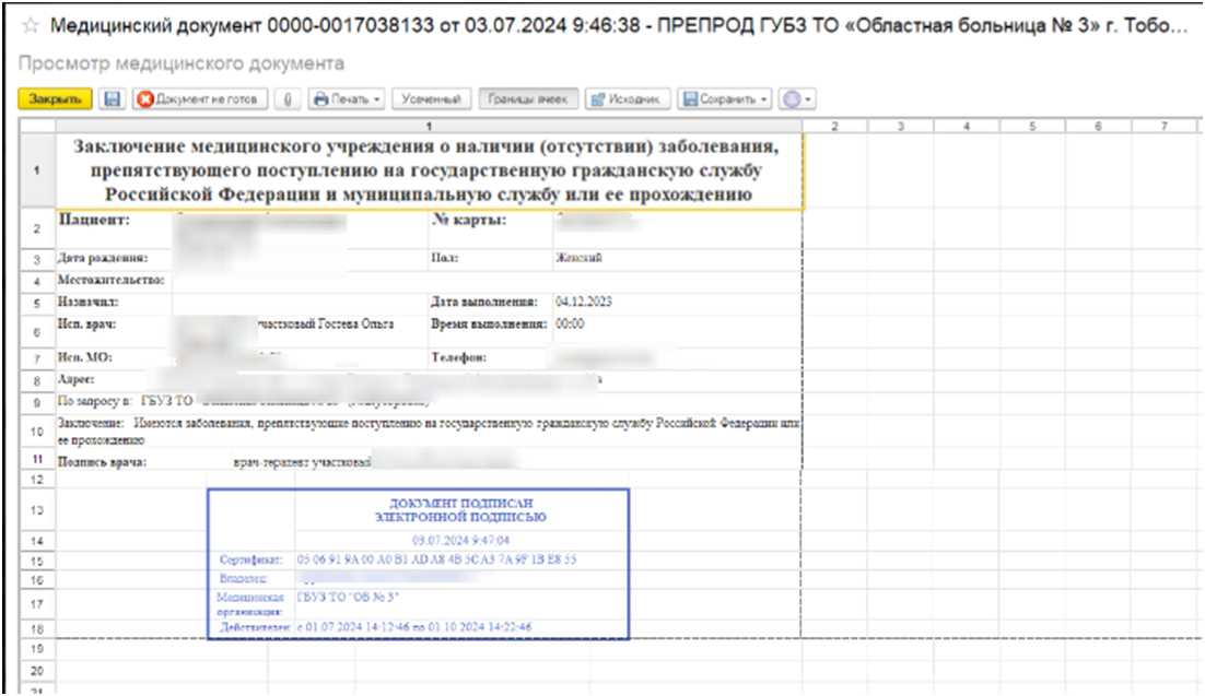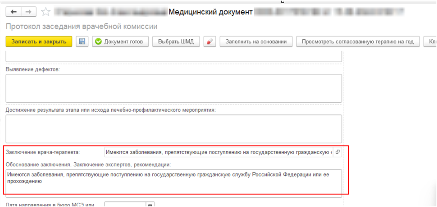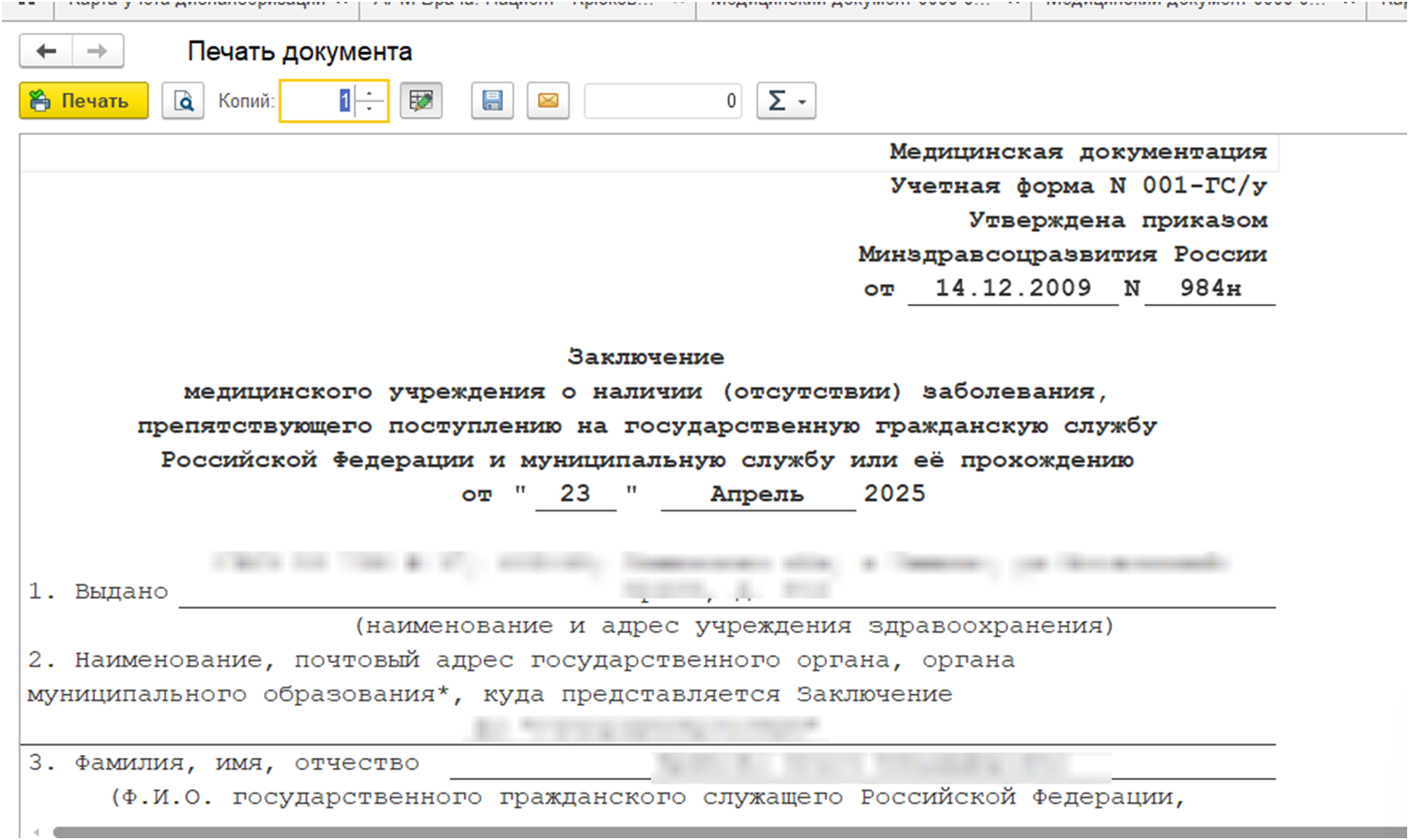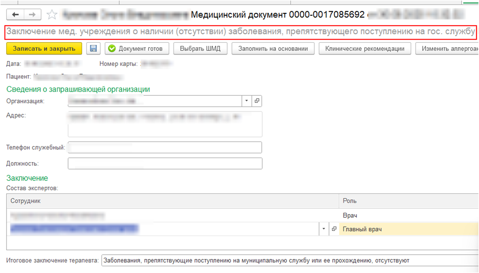 Рис. 54 ШМД «Заключение мед. учреждения о наличии (отсутствии) заболевания, препятствующего поступлению на гос. службу»
