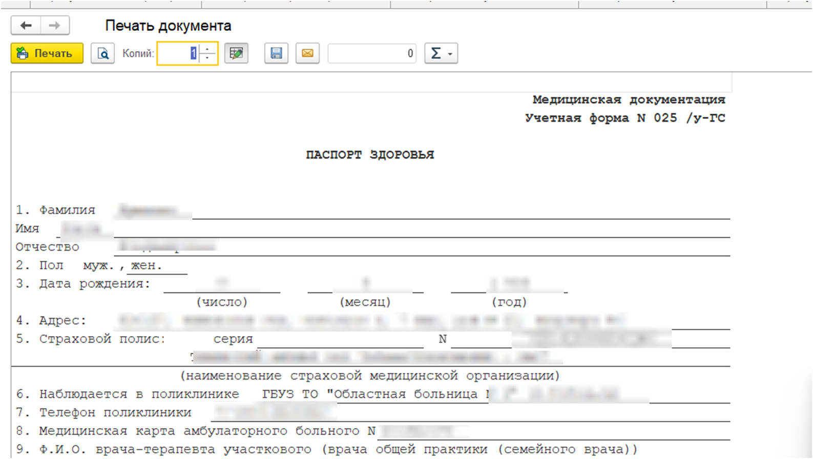 На форме документа «Карта учета диспансеризации» при нажатии на кнопку «Печать» выводится список печатных форм для выбора пользователем. Таким образом, пользователь устанавливает курсор в поле наименования печатной формы №025-у/ГС «Паспорт здоровья».