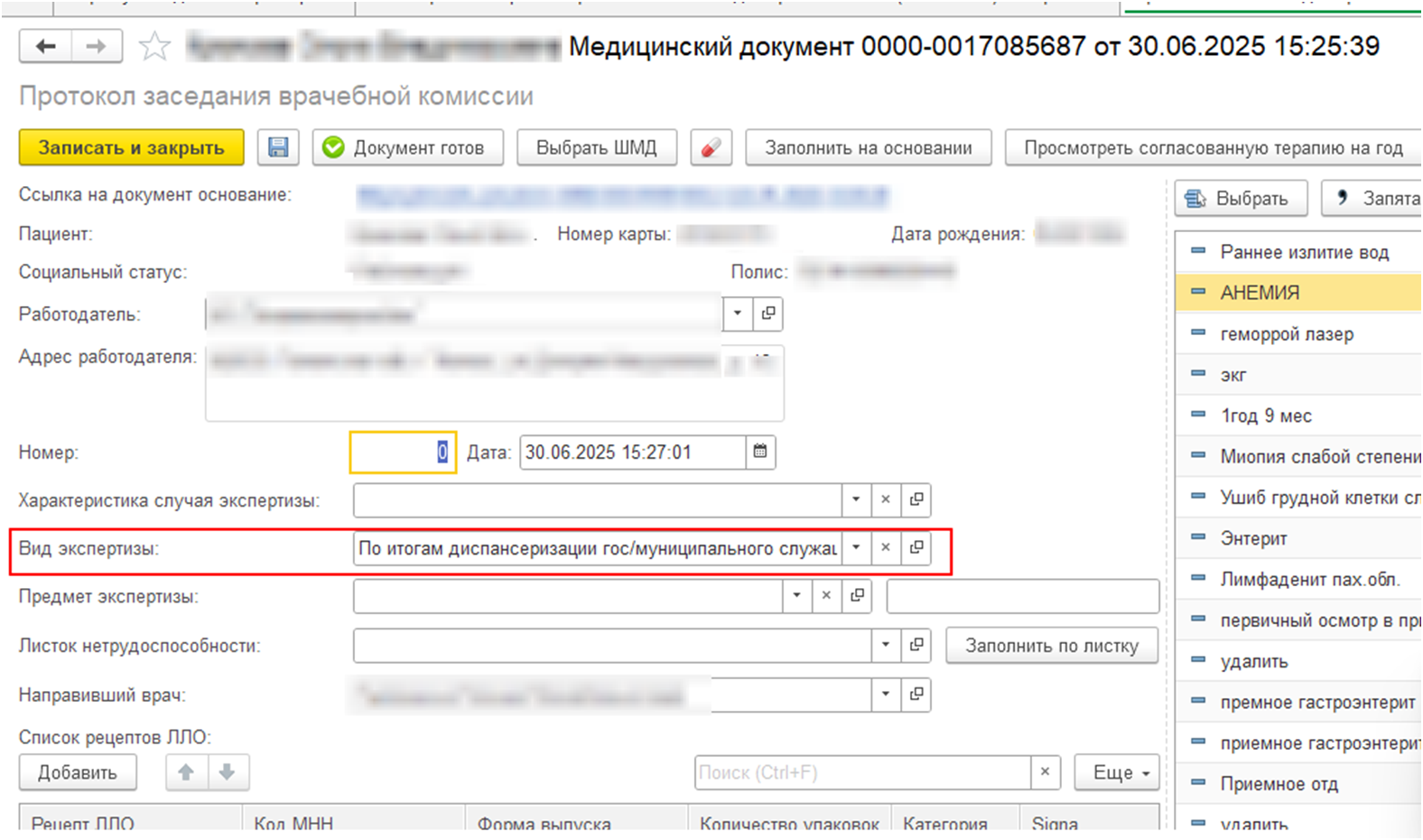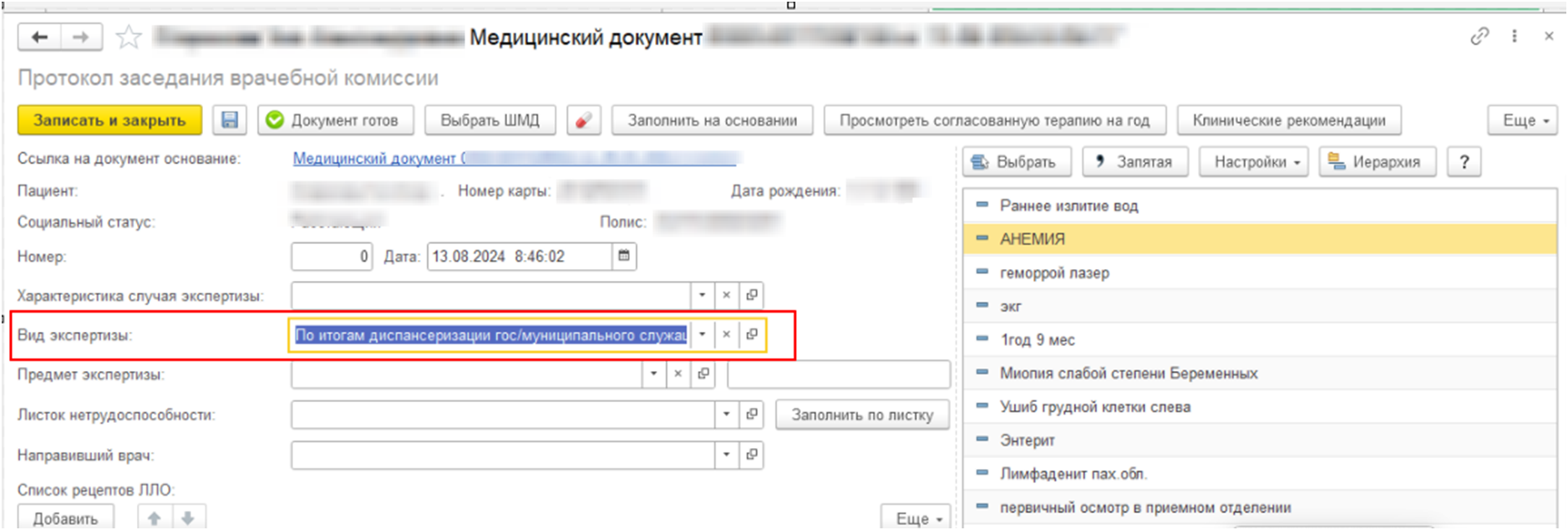 Таким образом, ШМД «Протокол заседания врачебной комиссии» заполнится автоматически, также заполнится автоматически поле «Вид экспертизы», относящийся к диспансеризации гос./муниципальным служащим (рис. №49).