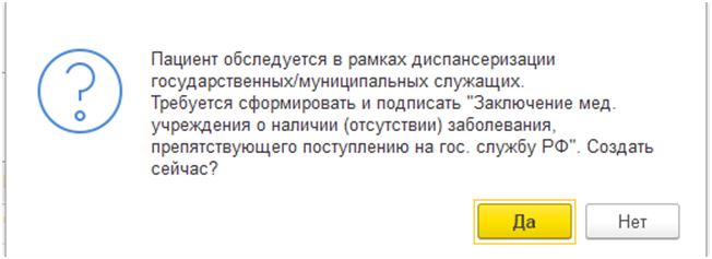 На этапе проведения документа выводится информационное сообщение о необходимости сформировать ШМД «Заключение медицинского учреждения о наличии (отсутствии) заболевания, препятствующего поступлению на государственную гражданскую службу Российской Федерации и муниципальную службу или её прохождению», пользователь нажимает значение «Да», если нужно сформировать ШМД, значение «Нет», если ШМД будет сформировано позже/не требуется формирование данного ШМД (рис. №53).