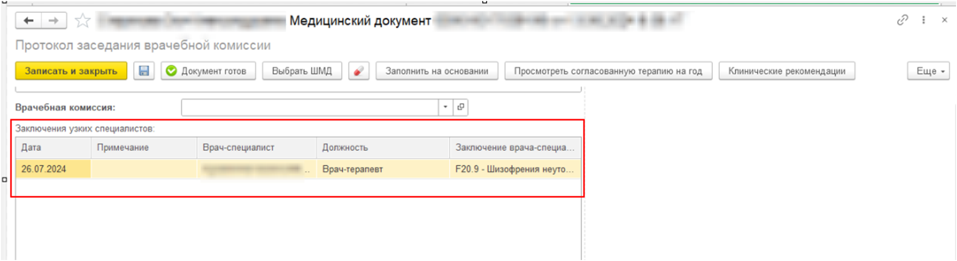 - заключение психиатра - автоматически заполняется из ШМД «Протокол осмотра психиатра»,