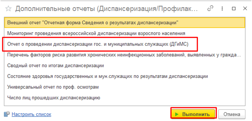 Далее, на форме «Дополнительные отчеты» выбираем отчет - «Отчет о проведении диспансеризации гос. и муниципальных служащих (ДГиМС)», нажимаем нажимаем кнопку «Выполнить» (рис. №37№58).