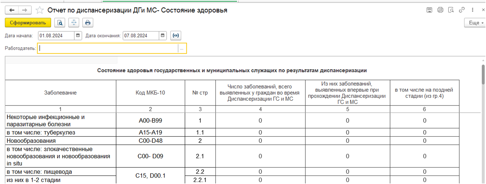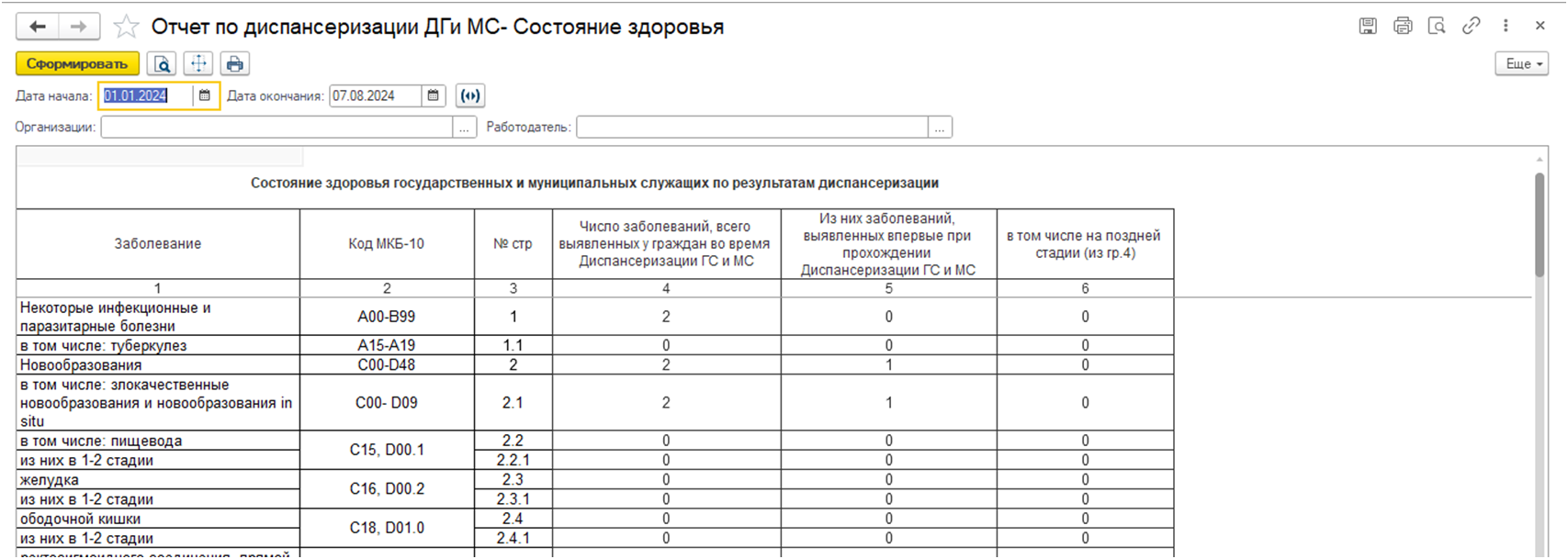 Рис. 68 Сформированный отчет «Состояние здоровья государственных и муниципальных служащих по результатам диспансеризации (локальный отчет)