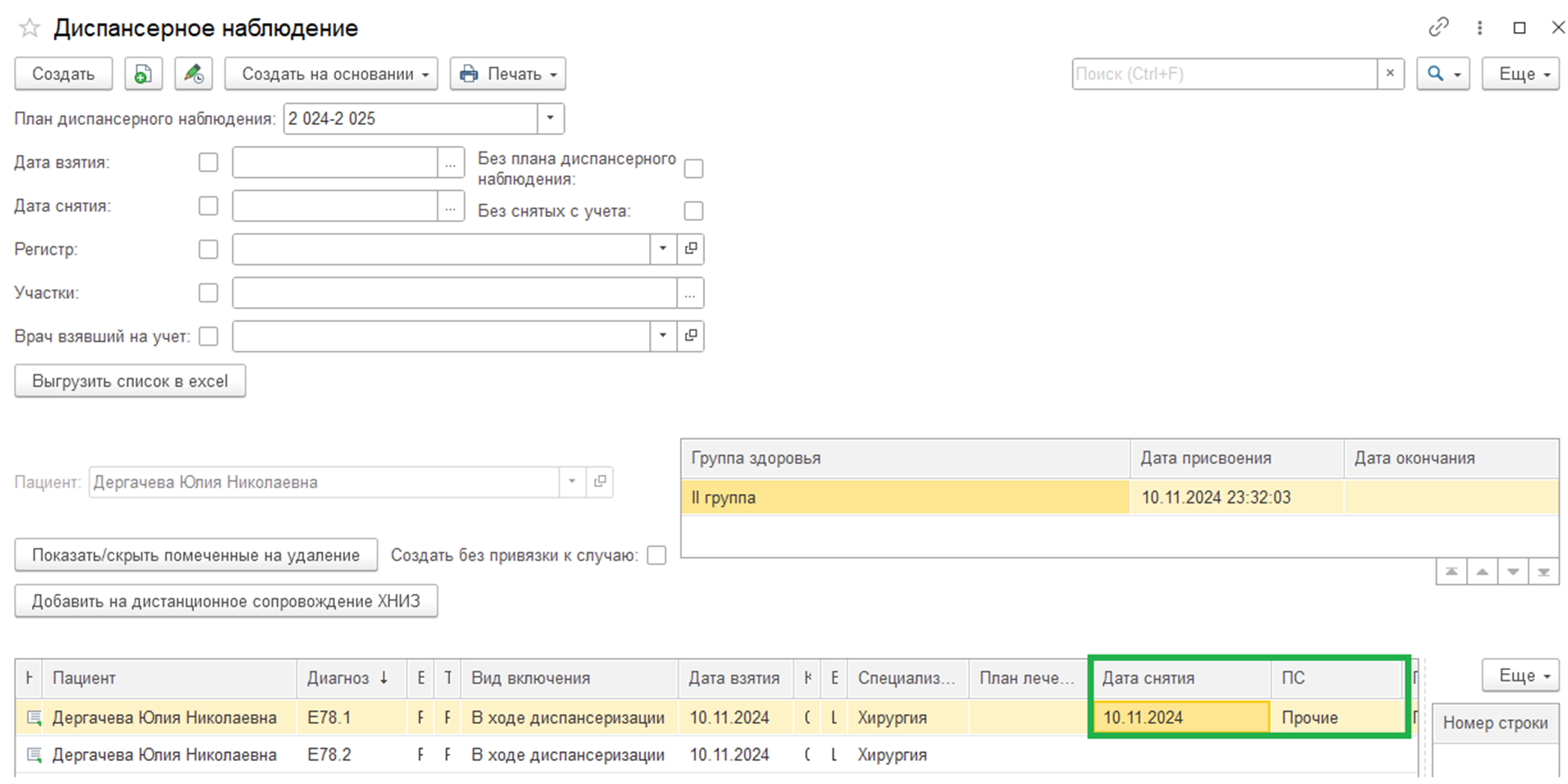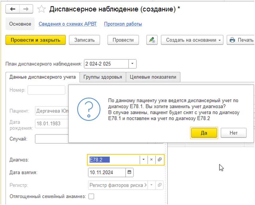 При выборе «Да», документ ДН с новым диагнозом подрубрики будет проведен, а по старому диагнозу снят с ДН с автоматическим заполнением даты снятия и причины снятия значением «Прочие» (рис.2):
