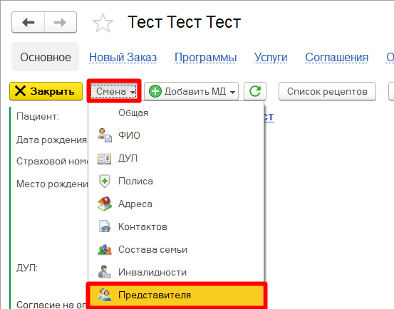 В открывшейся форме основных данных пациента выполнить команду «Смена» - «Представителя»