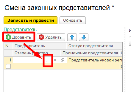 В форме «Смена законных представителей» выполнить команду «Добавить». В добавленном поле в табличной части нажать на кнопку «Выбрать»