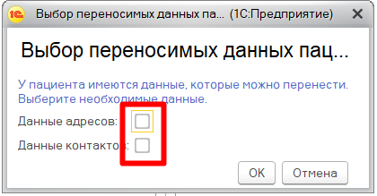 В открывшейся форме «Выбор переносимых данных пациента» в случае необходимости переноса сведений представителя установить галочку в полях «Данные адресов» и «Данные контактов» и далее выполнить команду «ОК»