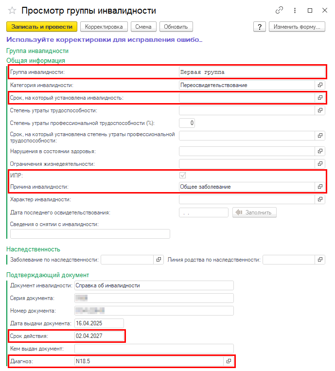 Для заполнения данных по группе инвалидности, необходимо заполнить следующие поля: