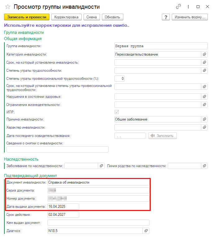 Функционал по смене или корректировки данных по группе инвалидности описан в п. 1.4.2. "Корректировка персональных данных пациента"