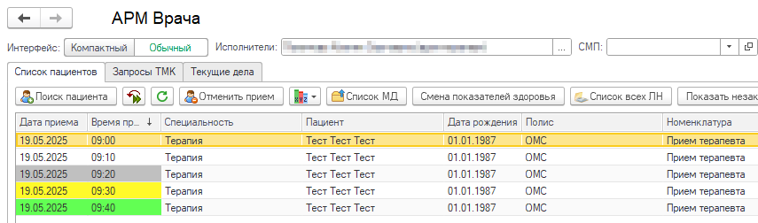 На вкладке "Список пациентов" отображаются пациенты, которые записаны на прием на указанную дату. В командной панели вкладки "Список пациентов" расположены кнопки для возможности записи пациента на прием самим врачом, отмены записи на прием, смены соглашения записи на прием и т.д.