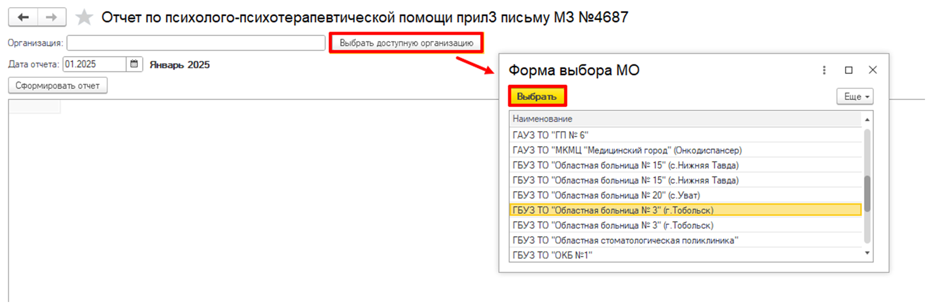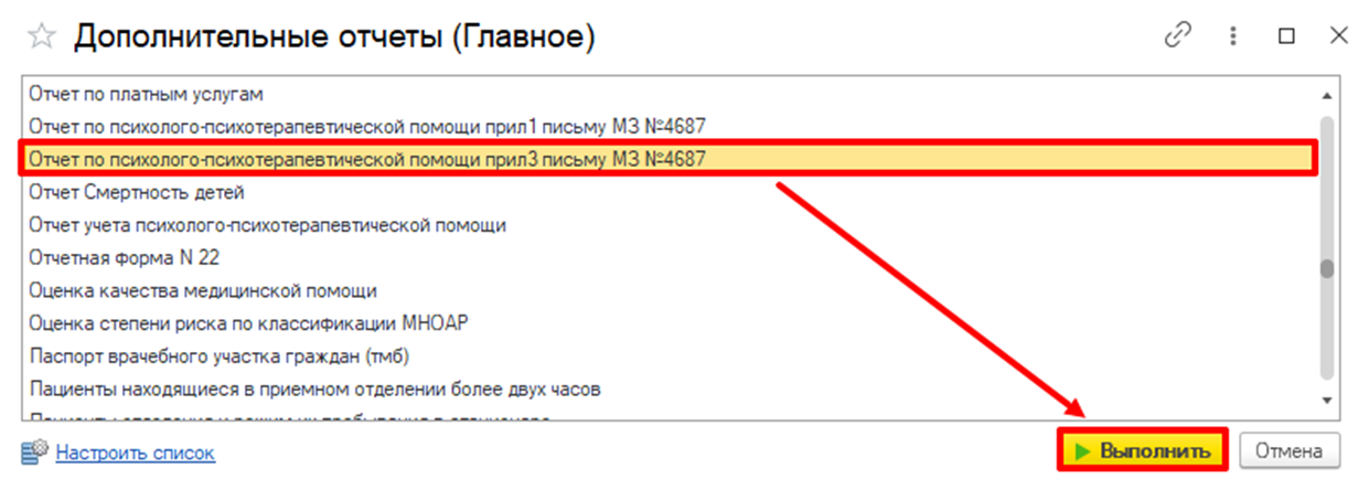 В открывшемся модальном окне необходимо выбрать отчет с названием «Отчет по психолого-психотерапевтической помощи прил3 письму МЗ №4687» и нажать кнопку «Выполнить» (рис. 2).