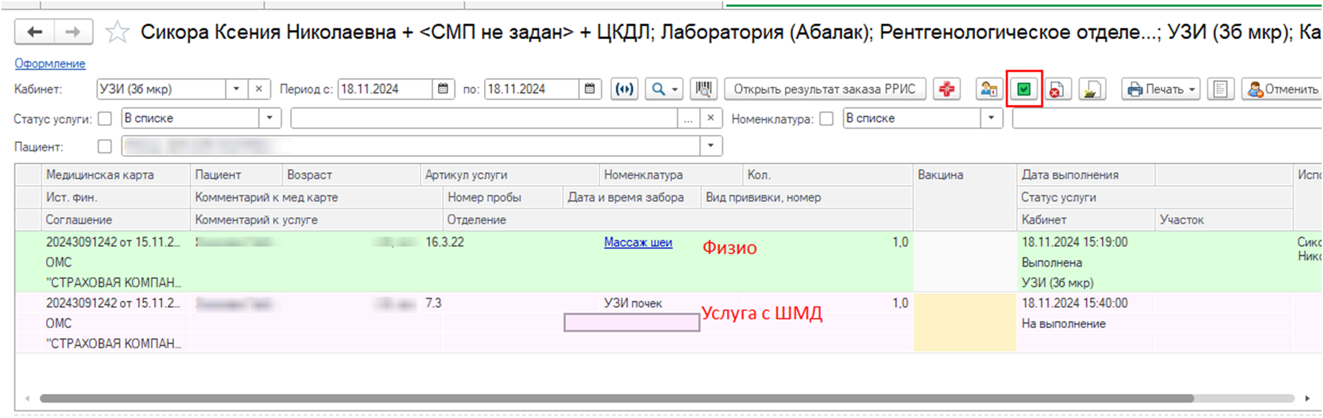 Рис.1 Пациент с назначенными услугами в Сменном задании, установка отметки исполнения