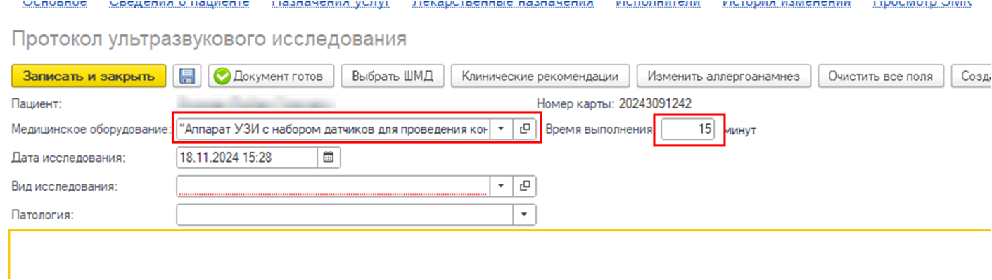 По услуге УЗИ открылся список ШМД для выбора. Выбрать Протокол ультразвукового исследования, заполнить поле «Медицинское оборудование», если требуется указать время в поле «Время выполнения». Заполнить остальные необходимые поля в ШМД и выполнить «Документ готов» (рис.2).