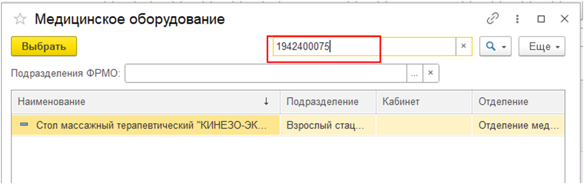 - Может оказаться так, что поле «Подразделение ФРМО» заполнено значением и ниже отображается усеченный список оборудования – т.е. система отобрала то оборудование, у которого заполнено именно это подразделение ФРМО.