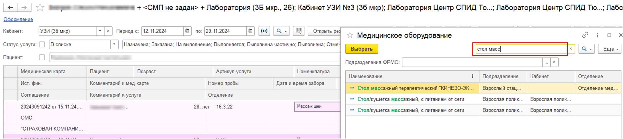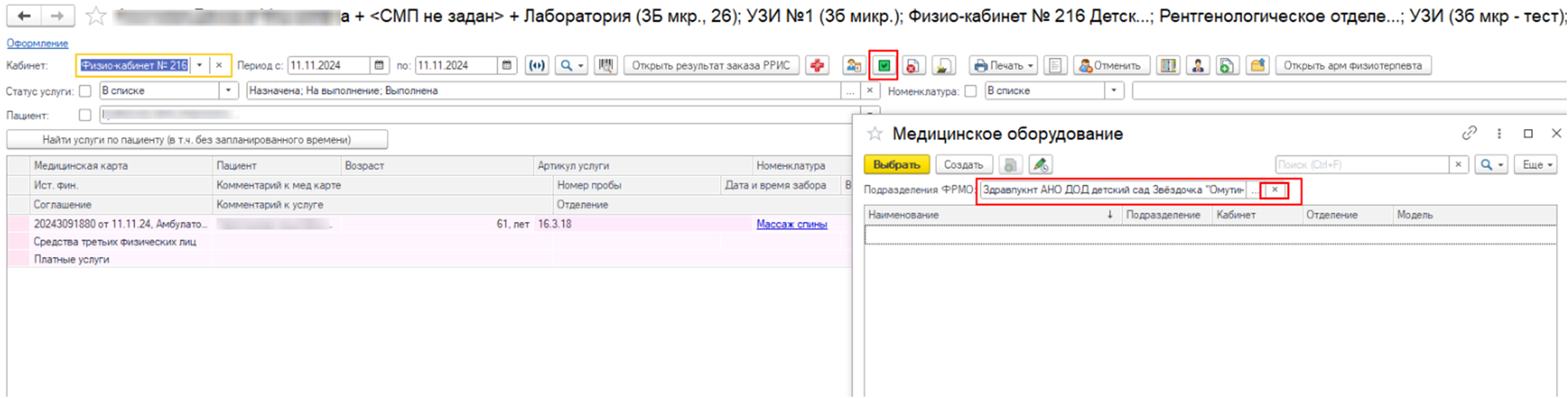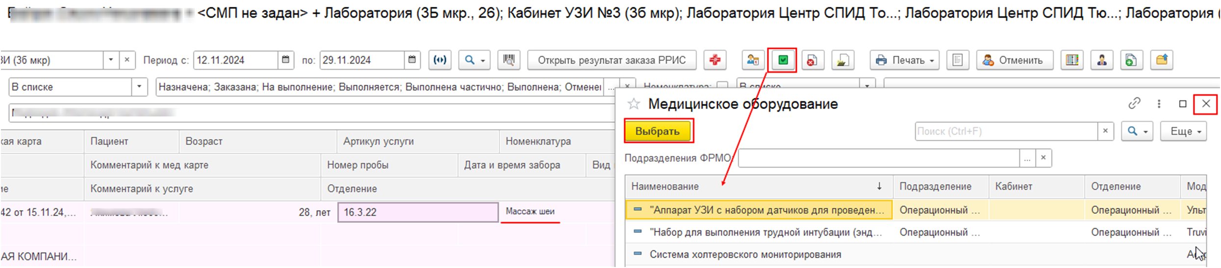 Рис.3 Выбор оборудования при исполнении физиотерапевтической услуги / услуги ЛФК