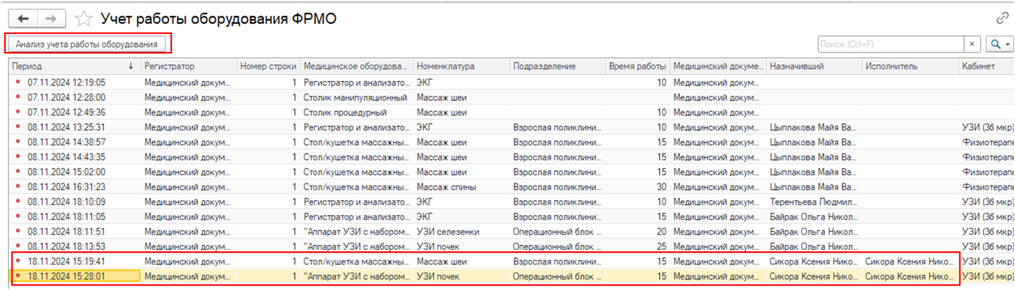 Двойным кликом щелкнуть по разделу Учет работы оборудования МО. Открылась форма регистра накопления, в котором мы можем увидеть выполненные услуги с выбранным медицинским оборудованием (рис.8).