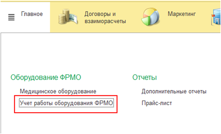 Врачу с профилем доступа Врач амбулатории, Врач стационара зайти Главное – Оборудование ФРМО. В разделе есть Медицинское оборудование (справочник) и Учет работы оборудования ФРМО (регистр услуг) (рис.7).