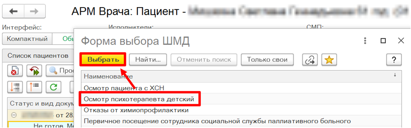 На вкладке «Прием» открыть случай. Далее в открывшейся форме выбора ШМД выбрать ШМД «Осмотр психотерапевта детский» двойным кликом либо по кнопке «Выбрать» (рис. 3).