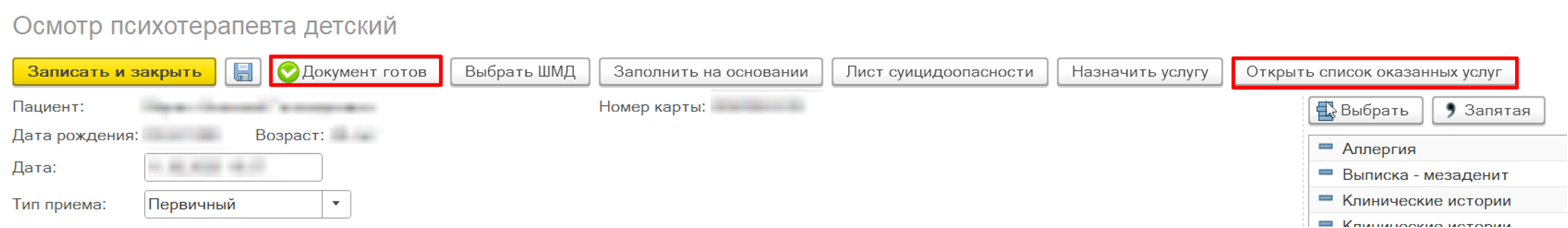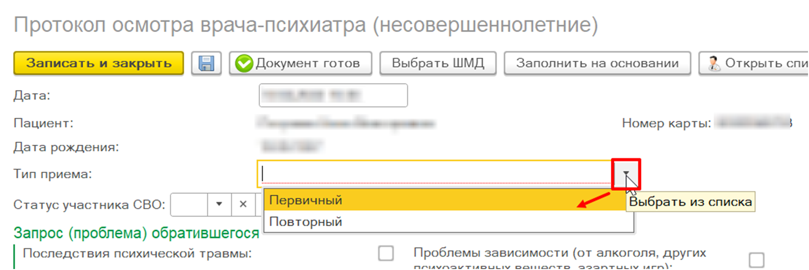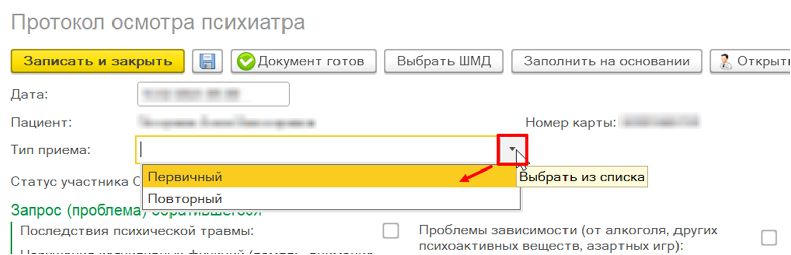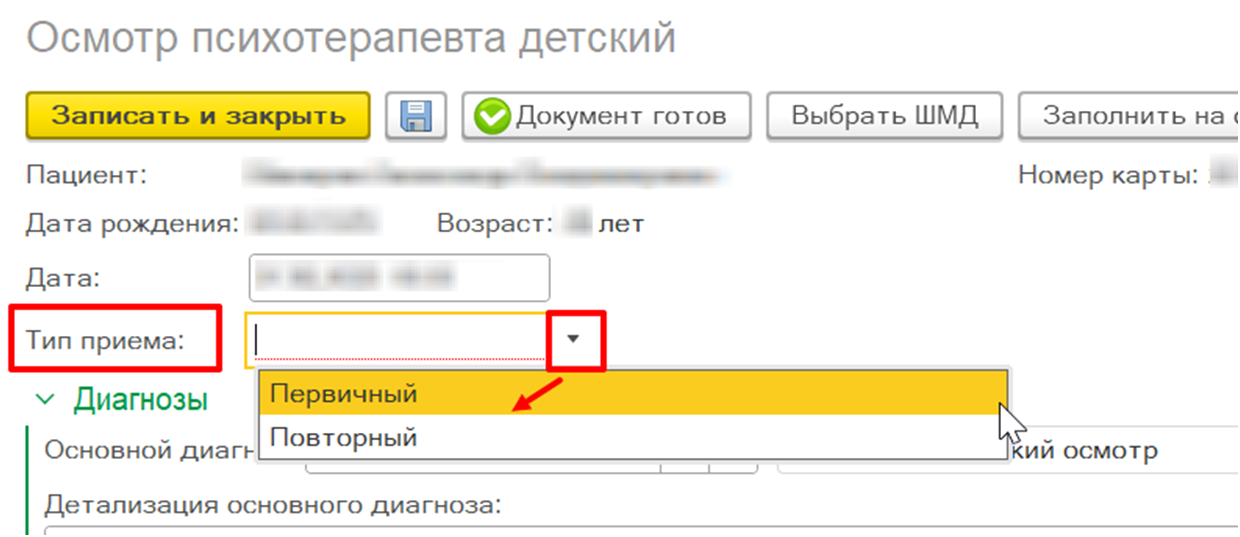 Внимание! В зависимости от типа приема в медицинском документе изменяется набор полей.