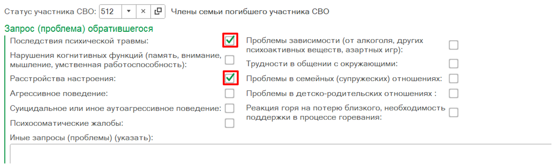 В блоке полей «Запрос (проблема) обратившегося» выбрать нужные значения (рис. 48). В текстовом поле «Иные запросы (проблемы)» указать проблемы, которые не перечислены.
