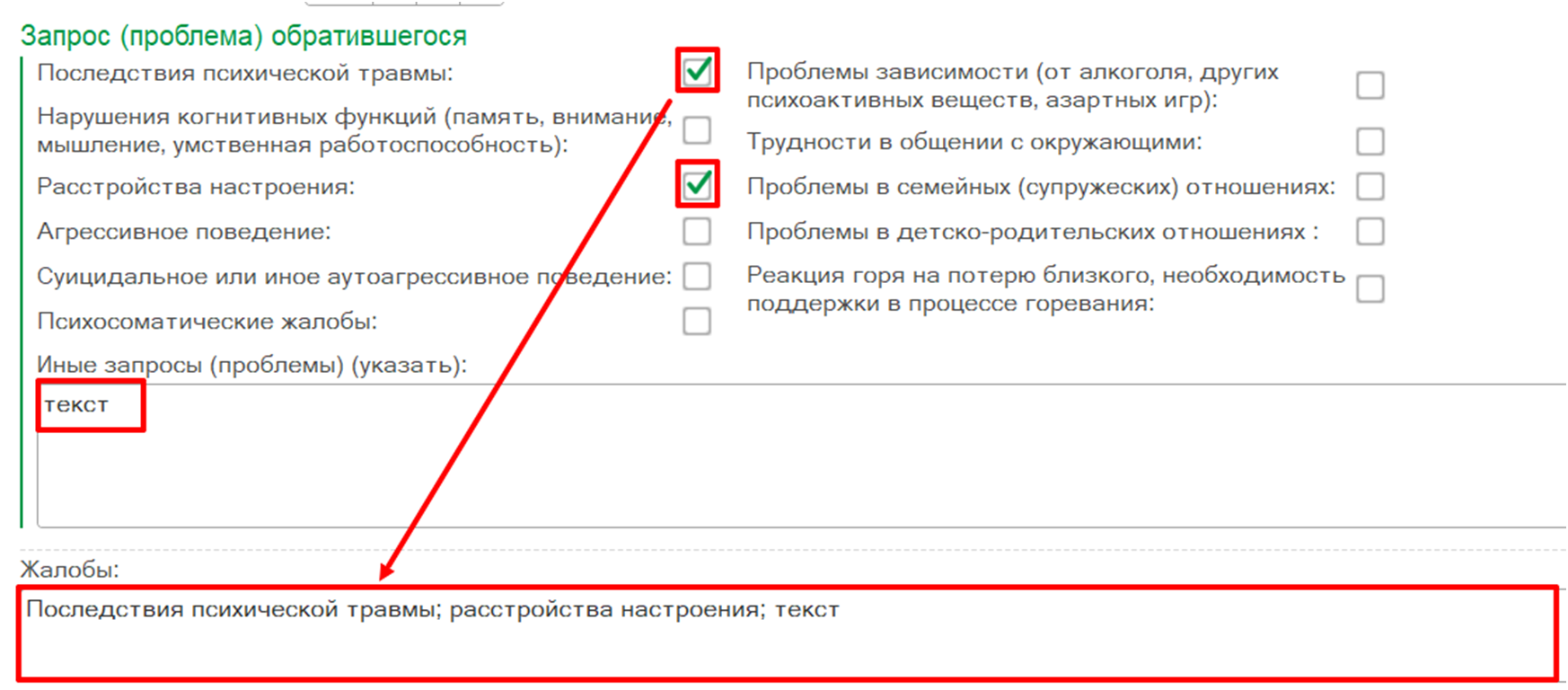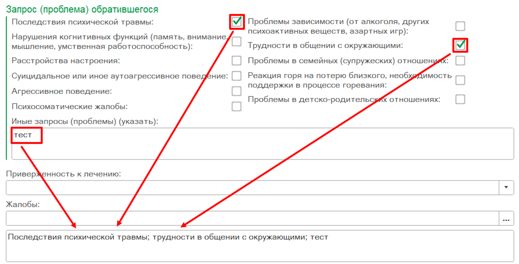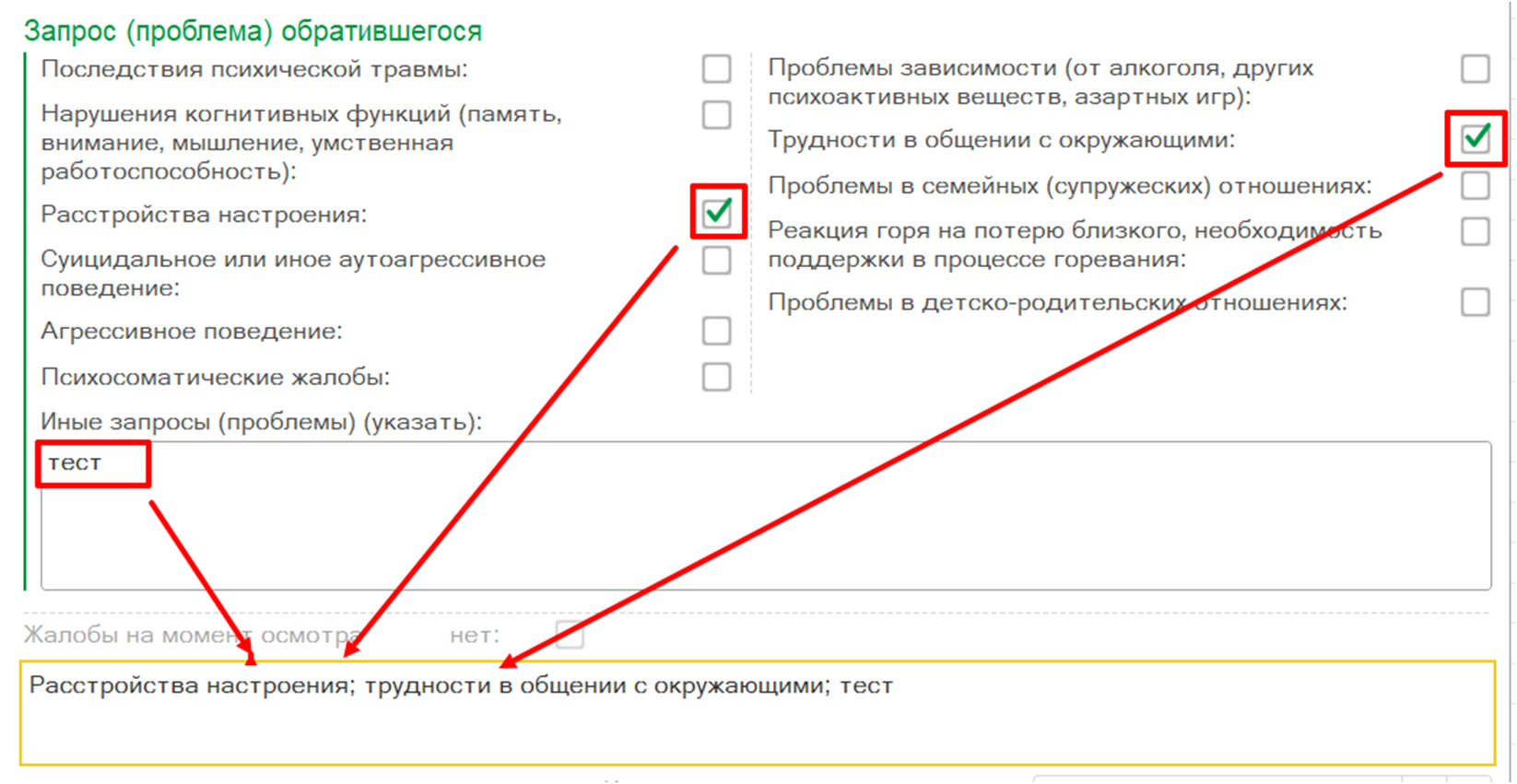 Выбранные запросы (проблемы) обратившегося отображаются в поле «Жалобы» (рис. 60). При снятии отметки в блоке полей «Запрос (проблема) обратившегося» соответствующая информация удаляется из поля «Жалобы».