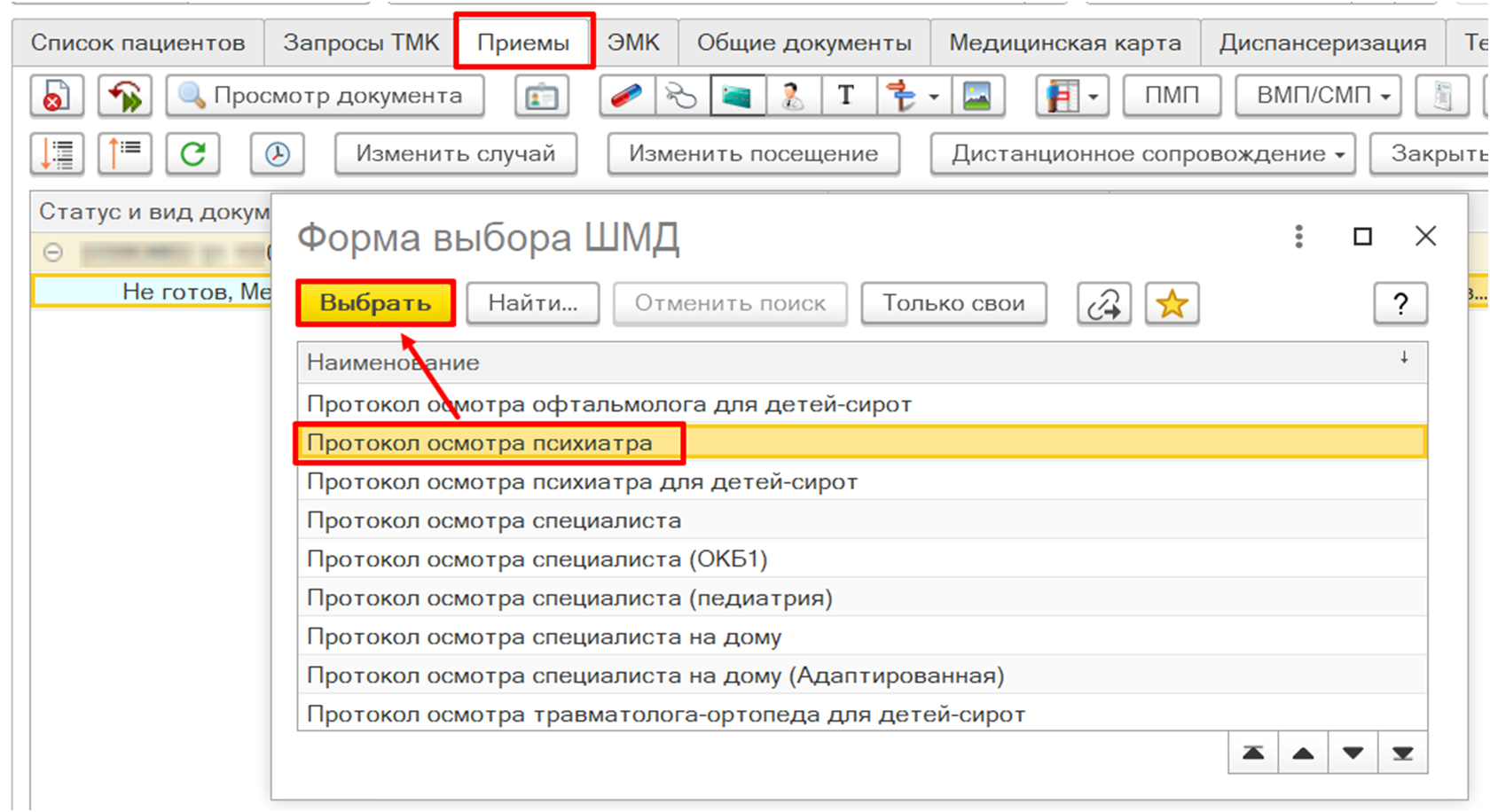 На вкладке «Прием» открыть случай. Далее в открывшейся форме выбора ШМД выбрать ШМД «Протокол осмотра психиатра для детей-сирот» двойным кликом либо по кнопке «Выбрать» (рис. 43).