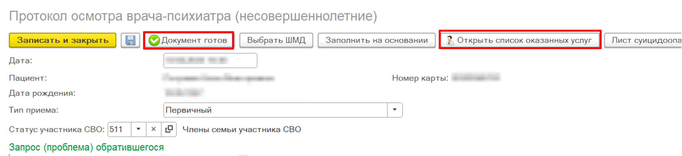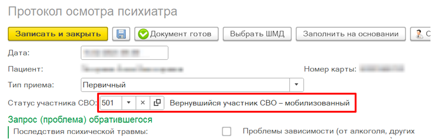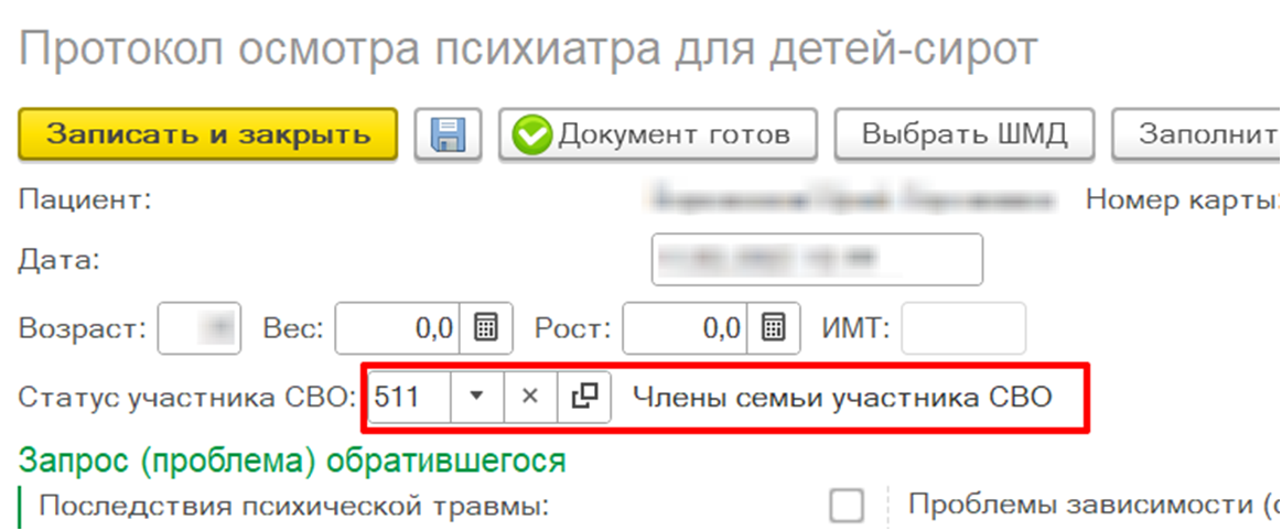Внимание! Внесенные данные в поле «Статус участника СВО» сохраняются только в формируемом медицинском документе и подтягиваются из данного документа в различные отчеты по СВО при оказании психолого-психотерапевтической помощи. В ОДП информация по статусу участия в СВО  не сохраняется.
