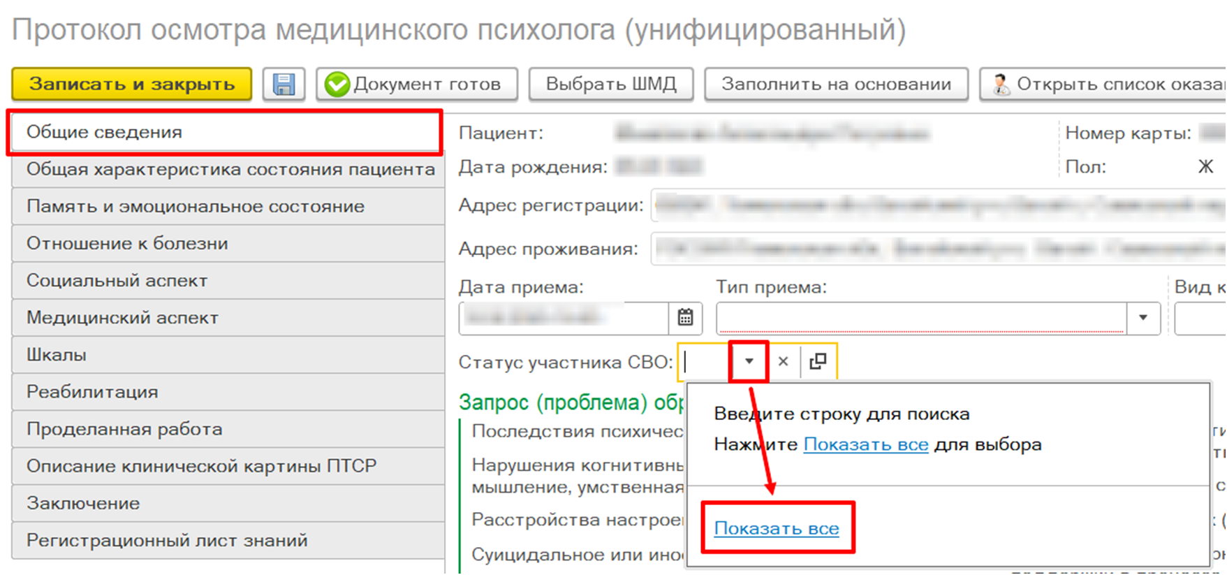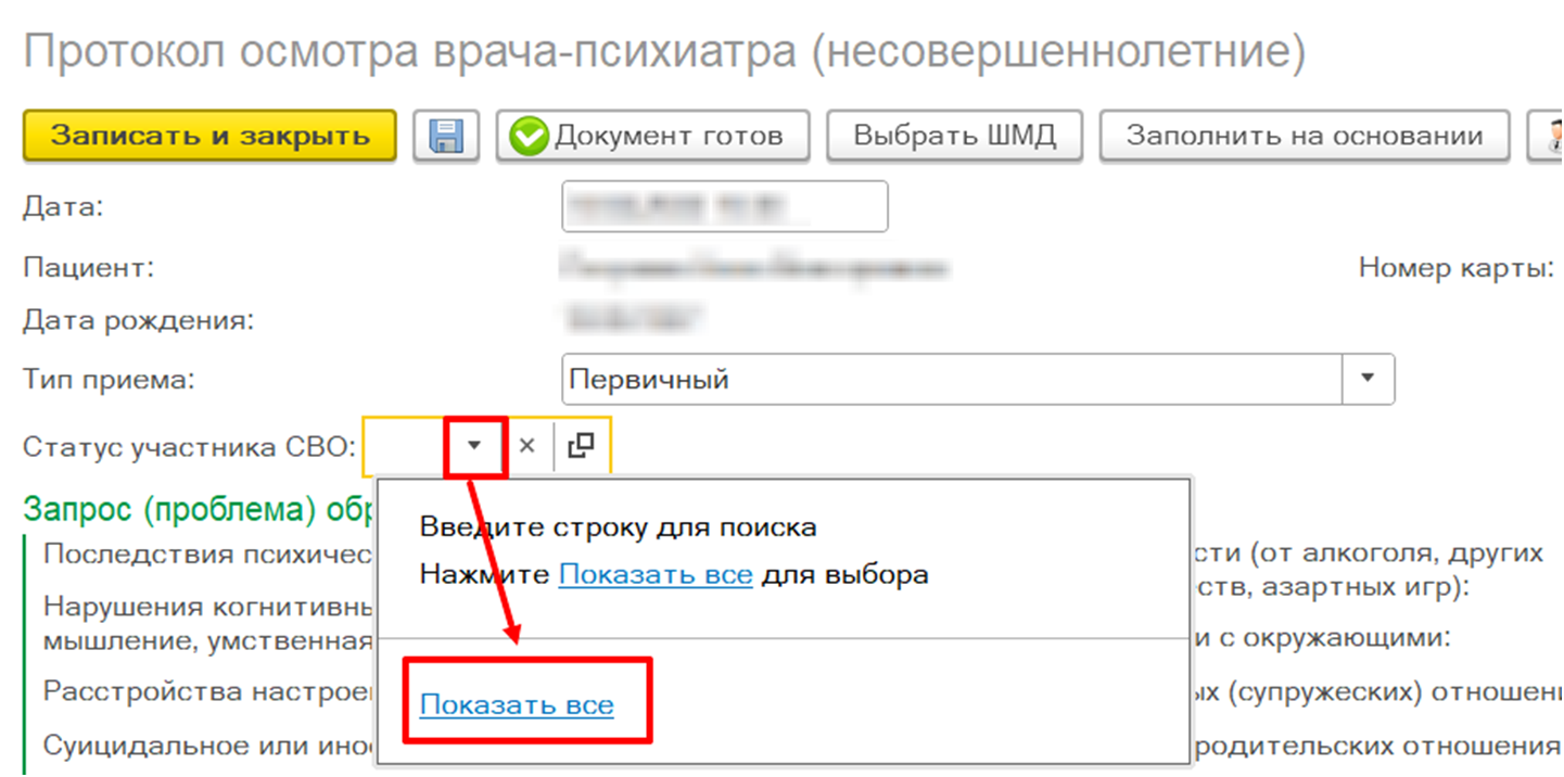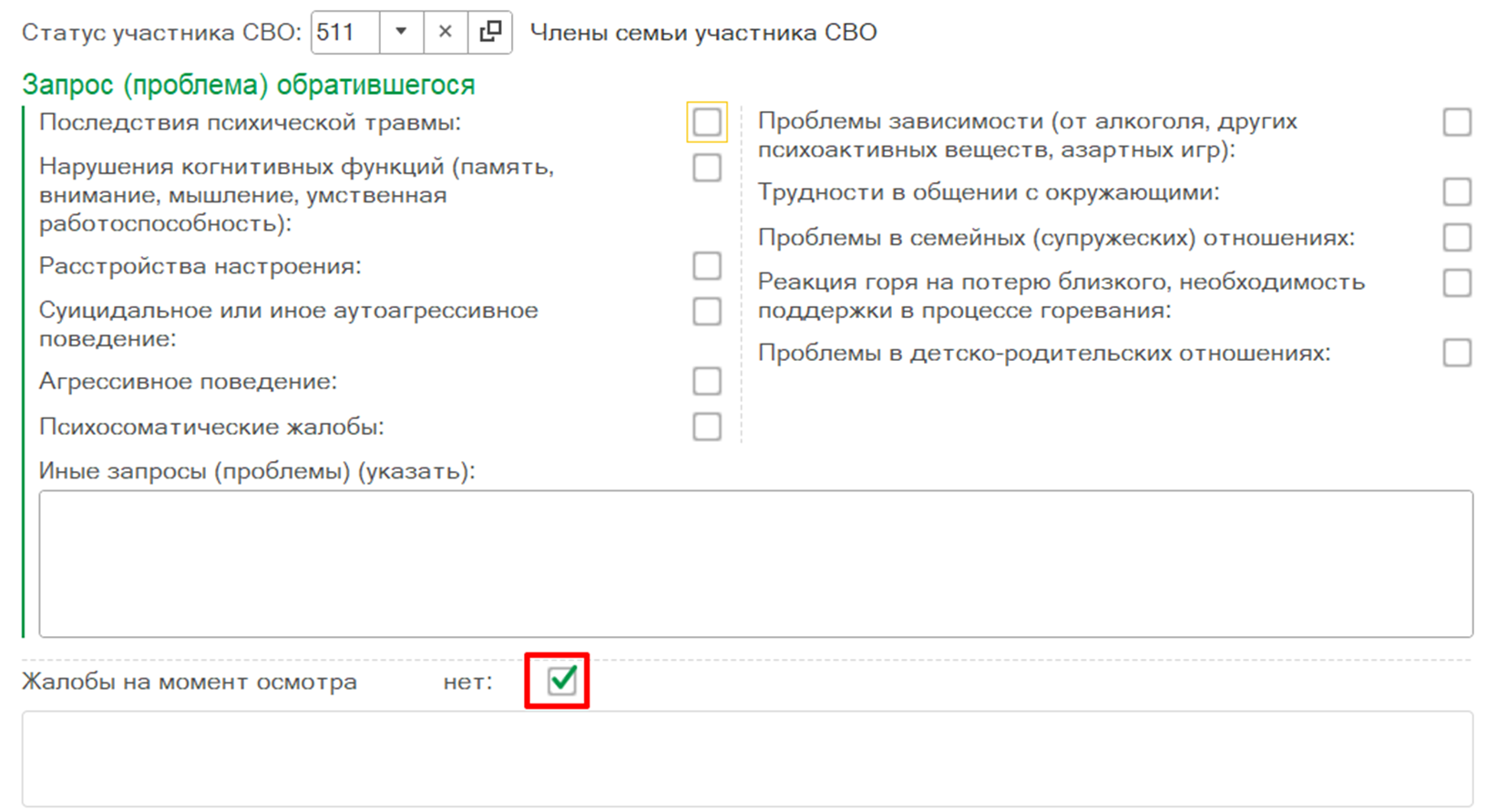 Блок полей «Запрос (проблема) обратившегося» отображается для всех пациентов вне зависимости от наличия статуса участия СВО.