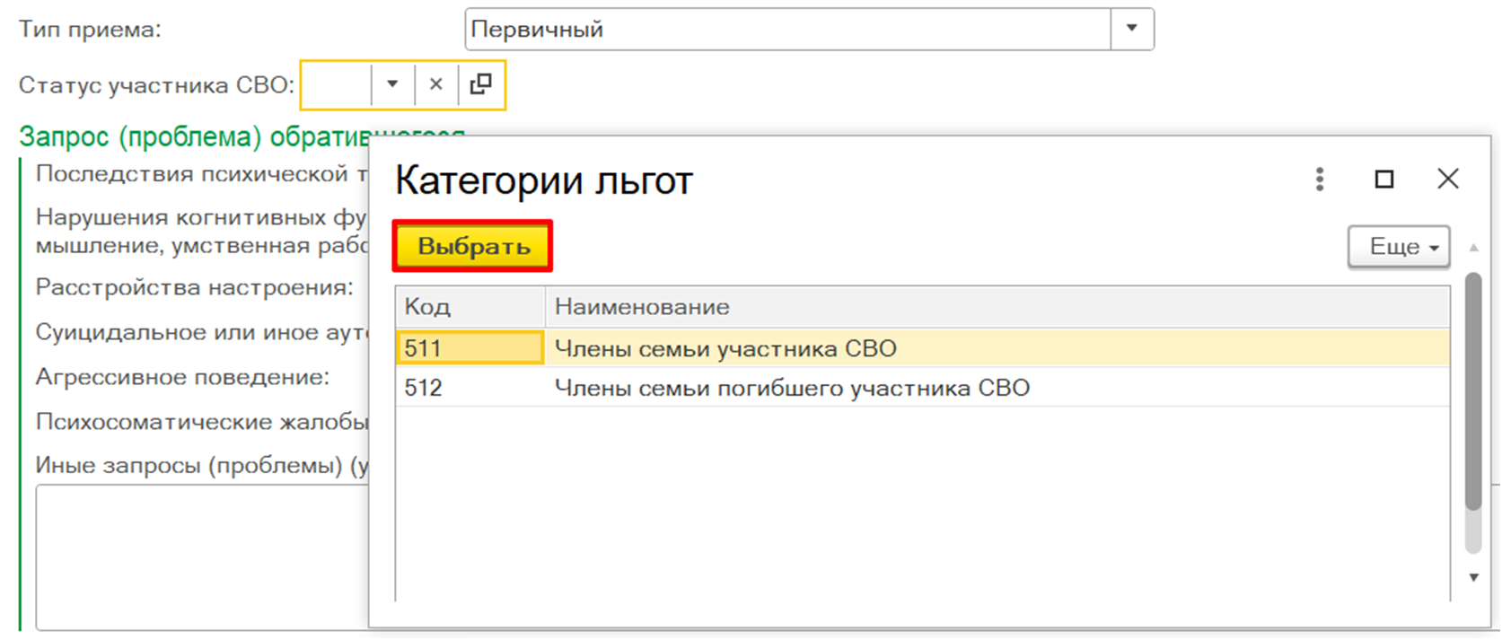 Рисунок 7 – Выбор значения в справочнике «Категории льгот»