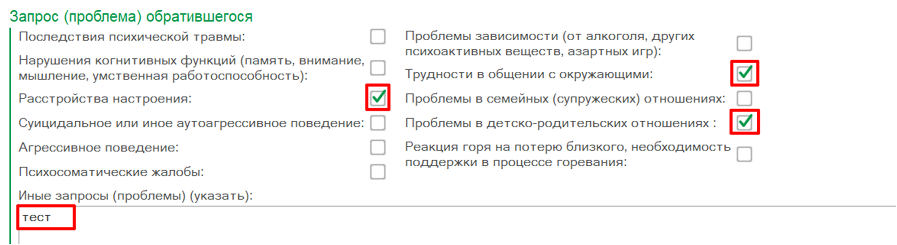 Далее в блоке полей «Запрос (проблема) обратившегося» следует отметить нужные значения (рис. 28). В текстовом поле «Иные запросы (проблемы)» указать проблемы, которые выше не перечислены.