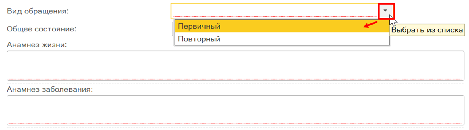 В медицинском документе поле «Тип приема» является обязательным для заполнения. Для заполнения поля следует нажать на кнопку «Выбрать из списка» и в выпадающем списке выбрать тип приема «Первичный» или «Повторный» (рис. 4).