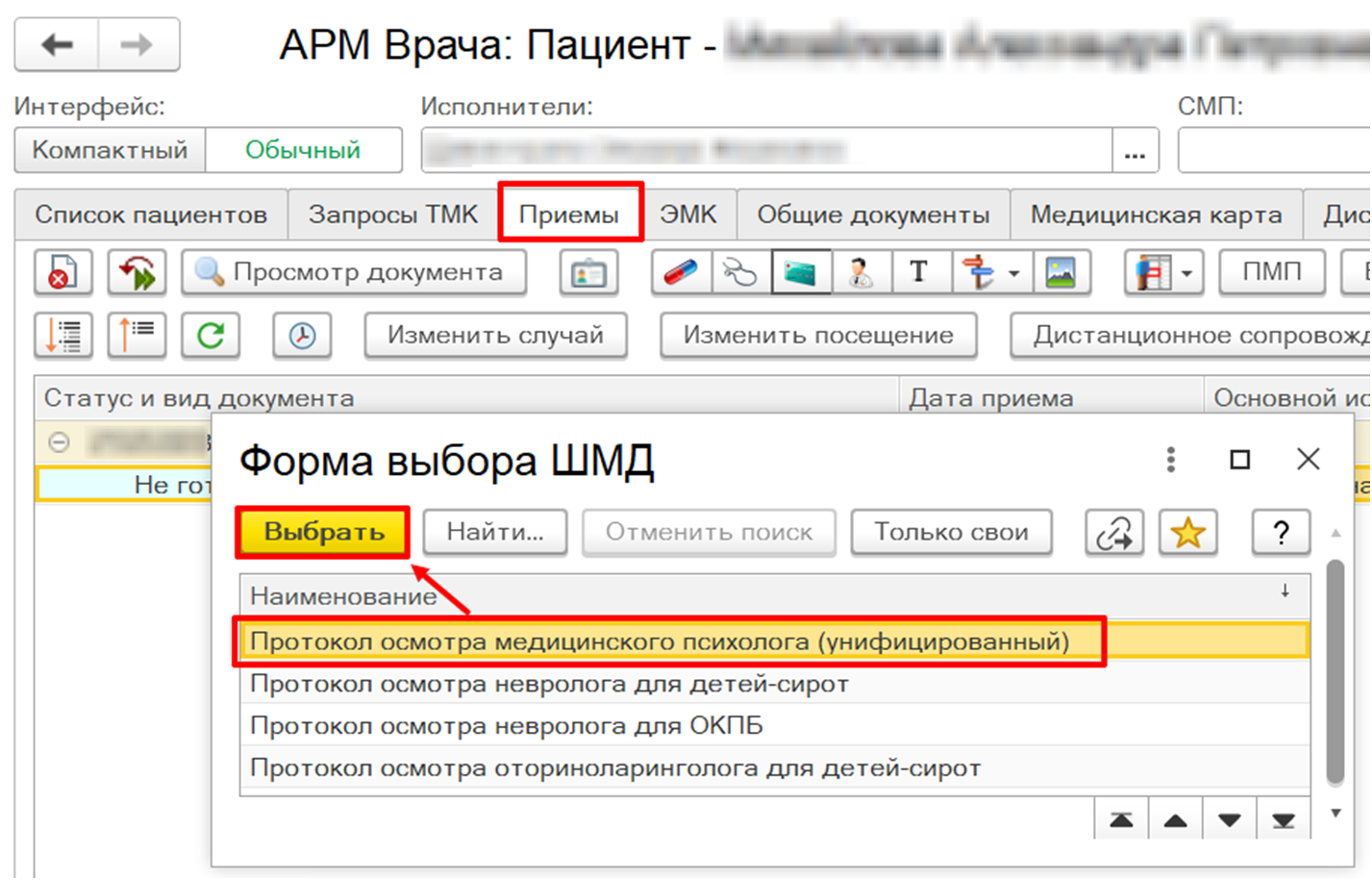 На вкладке «Прием» открыть случай. Далее в открывшейся форме выбора ШМД выбрать ШМД «Протокол осмотра врача-психиатра (несовершеннолетние)» двойным кликом либо по кнопке «Выбрать» (рис. 23).
