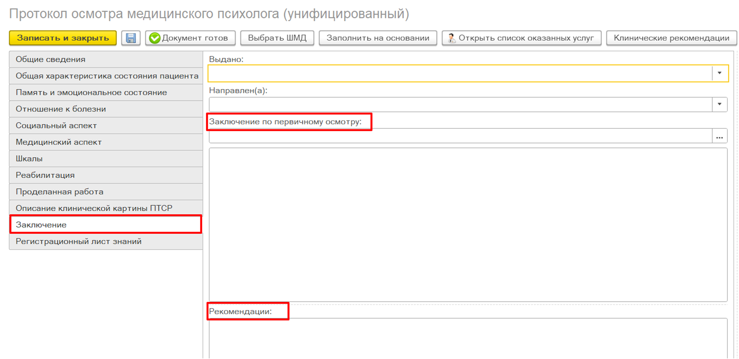 Внимание! Заполненная информация в полях «Заключение» и «Рекомендации» подтягивается в различные отчеты по СВО при оказании психолого-психотерапевтической помощи. Данные поля в медицинском документе не обязательные для заполнения, но информация необходима для отображения в отчетах.