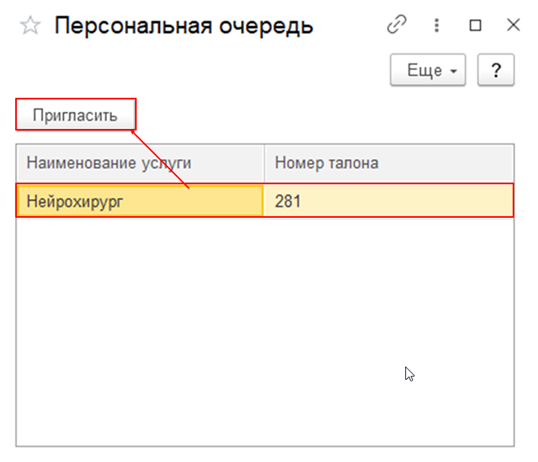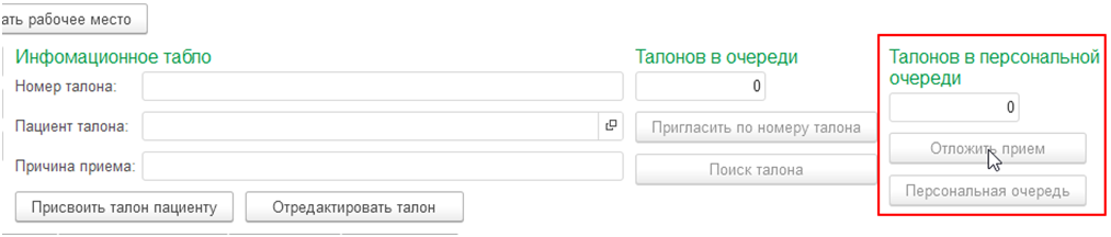 В результате талон попадет в список персональной очереди. В поле «Талонов в персональной очереди» будет отображаться количество талонов ожидающих приема в персональной очереди. При нажатии на кнопку «Персональная очередь» откроется форма для вызова талона из персональной очереди, выберите талон