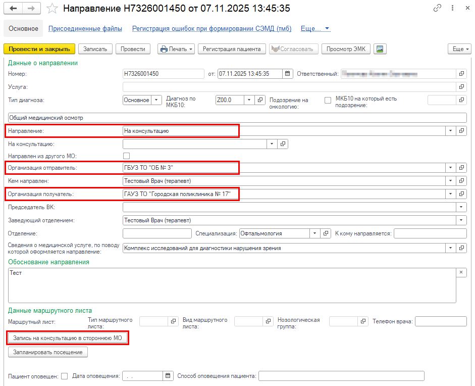 Направление "Направление Н7326001450 от 07.11.2025 15:24:33" успешно изменено в "ГАУЗ ТО "Городская поликлиника № 17"".
