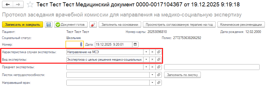 - "Вид экспертизы" = "Экспертиза с целью решения медико-социальных проблем"