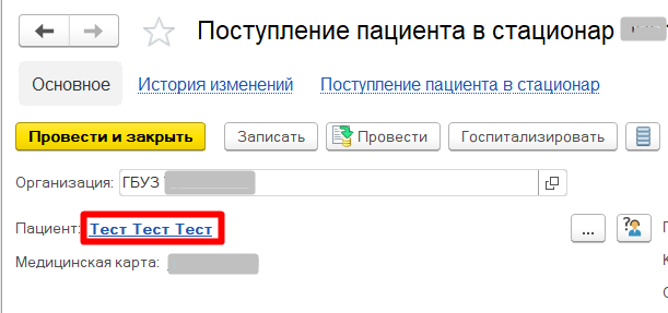 В списке пациентов на госпитализацию, выбрать нужного пациента и открыть документ "Поступление пациента в стационар" путем двойного нажатия по пациенту.