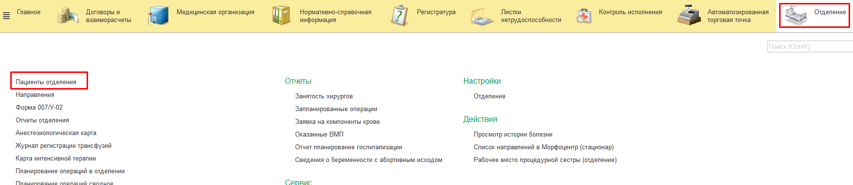 Для того, чтобы приступить к работе с функционалом просмотра информации о пациентах, которым была оказана ВМП и формирование отчетных документов, необходимо  открыть подсистему «Отделение», перейти по ссылке «Пациенты отделения».